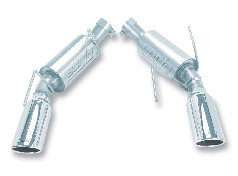 For over 4 decades, Borla(r) Exhaust has been the choice of Mustang experts, from the Cobra-R SVT Mustang to the Ford GT. Major players in the racing industry and leading tuners from Roush, Steeda, Saleen and Ford Racing to the Shelby 427 Cobra have relied on Borla(r). This awesome Axle-Back system bolts on, is lighter than the factory system, includes our famous S-Type mufflers with outstanding flow numbers that generate great power enhancements, and features bright chrome on T-304 stainless steel tips. These attributes, coupled with an aggressive sound of power and awesome big tip, proclaim this Stang is all business. Airflow management and exhaust engineering is a science with which Borla(r) has more experience than anyone in the exhaust aftermarket. The performance matches the famous Borla(r) systems of the past but with a unique muffler and exhaust configuration canceling additional high frequency sound waves. Delivering a significant increase in CFM from the factory system which, as most engine builders will confirm, accounts for the dramatic power improvements. Perhaps more importantly, this added flow maximizes performance for other aftermarket enhancements installed on the Mustang because all Borla(r) exhaust products are tuned for maximum output from any aftermarket performance upgrade. Two Axle-Back options are also available: an aggressive S-Type (PN 11750) and a more mellow Touring (PN 11752) both replace only the over-the-axle pipes, mufflers and tips. Borla(r), the original pioneers of high-quality, T-304 austenitic stainless steel (superior to 409 or aluminized steel) free-flow exhaust utilizes patented award and race winning technology to deliver quality, sound, performance gains and enhanced fuel economy all with an easy bolt-on installation. Unsurpassed written Million-Mile Warranty.