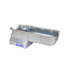 This Small Block Chevy "T" sump drag race oil pan is for pre-?80 blocks with a left side dipstick. It has a 7-1/2" deep, 9-1/2" long by 10-1/2" wide sump and an 7 qt system capacity. This pan requires a short oil filter, and one of our pickups. Will work with stock or aftermarket starters.