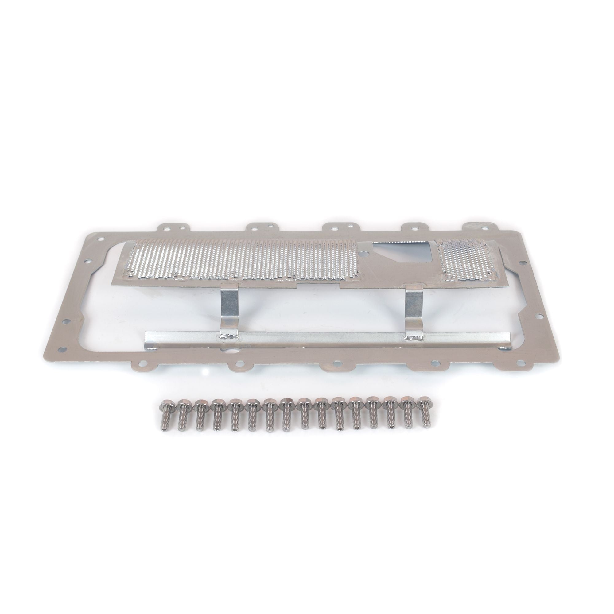 4.6/5.4 Ford Screen Windage tray for stock or aftermarket oil pans. Mounts between the oil pan and block, includes oil pan studs and nuts. When using with stock 4 valve mustang pickup, scraper on pickup must be removed for clearance. Note: Sealer between tray and block recommended with gasket between tray and oil pan.