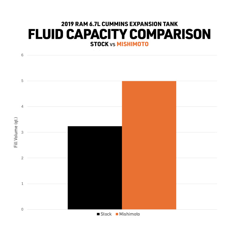 The factory expansion tank on your 2019+ Ram 6.7L Cummins is a weak point in an otherwise durable cooling system. Made from plastic, the stock tank becomes brittle over time and is prone to cracking, discoloration, and internal degradation after thousands of heat cycles. Mishimoto’s aluminum expansion tank is built to solve that problem before it starts. Its TIG-welded construction holds up under high temperatures and heavy use, while internal baffles prevent coolant starvation and reduce the risk of air pockets that can harm engine cooling.--To make installation simple, this expansion tank fits directly in place of the factory unit and does not require draining the entire cooling system. No specialty tools are needed, and all necessary provisions for factory sensors are included. That includes an OEM-style level sensor that allows the truck’s stock low coolant warning system to function exactly as intended.--Beyond durability and ease of install, this expansion tank gives your engine bay a cleaner, more finished look. The Mishimoto expansion tank is available in either micro-wrinkle black or a natural finish, for easy customization through powder-coating, anodizing, or hydro-dipping. It replaces the aging plastic tank with something built to last and designed to look good doing it.--Like all of our products, this expansion tank is backed by the Mishimoto Lifetime Warranty.
