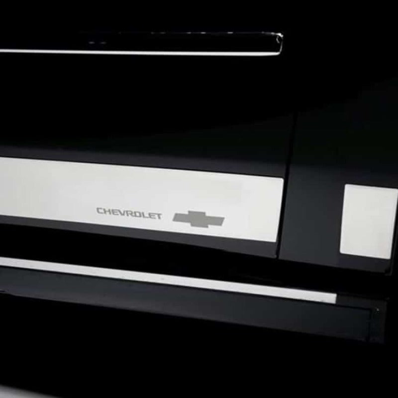 Upgrade your Chevy with the Putco Chevy Bow-Tie Logo stainless steel rocker panels. These GM licensed panels don’t just look good on your truck but also protect your rockers from getting chipped and damaged by carts, other doors, and debris from the road.We have constructed these rocker panels to last a lifetime, made out of 26GA premium T-304 stainless steel that is polished to have a mirror-like finish. Also, these panels have a Chevy Bow-tie etched into the drive and passenger-side door panel. Each panel is custom-designed to fit the contour of your year, make, and model. Also, each panel is pre-applied automotive-grade 3M adhesive, so instilling is as easy as cleaning the area and pressing the panel into place. Each kit is designed and manufactured in the USA By Putco Inc Des Moines IA.If you want to show your Chevy pride and protect your truck at the same time, then the Putco Chevy Bow tie Logo black stainless steel rocker panels. These rocker panels are made in the USA and are backed by Putco’s NeverRust™ Limited Lifetime Warranty.