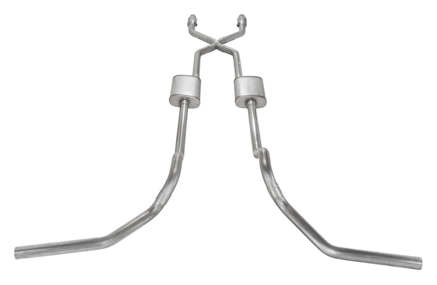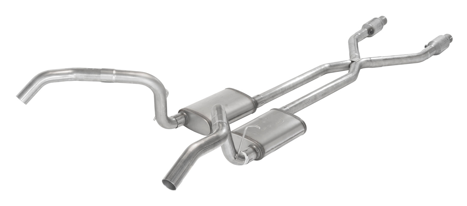 Crossmember Back w/X-Pipe Exhaust System 75-87 GM Split Rear Dual Exit 2.5 in Intermediate And Tail Pipe Violator Muffler/Hdw Incl Tip Not Incl Natural Finish 409 Stainless Steel Catalytic Converter Incl Pypes Exhaust