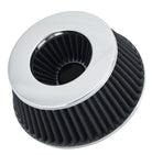 This Spectre High Performance Racing (HPR) Air Filter is a black media clamp-on cone filter that can be used for a wide variety of applications. Using the included adapter rings, this filter can fit 3 inch, 3-1/2 inch, and 4 inch diameter tubes. Manufactured using high quality materials throughout, including oiled synthetic media, urethane, and steel mesh, this washable performance filter is precision engineered for low restriction and better performance. This filter's top houses an inverted cone filter for improved service life and enhanced flow potential. Designed with a triple chrome plated steel top and base, this 2-1/2 inch tall air filter is factory pre-oiled and ready to use.