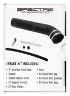 Spectre's Aluminum Air Intake Kit is a universal system that fits many vehicle applications. This air intake comes complete with a 3 inch black textured powdercoated intake tube, integrated air sensor inlets, adapters and support brackets. The Spectre filter is sold separately and may require additional components to install with this kit. This intake is not legal for use in California or other states adopting California emission standards.