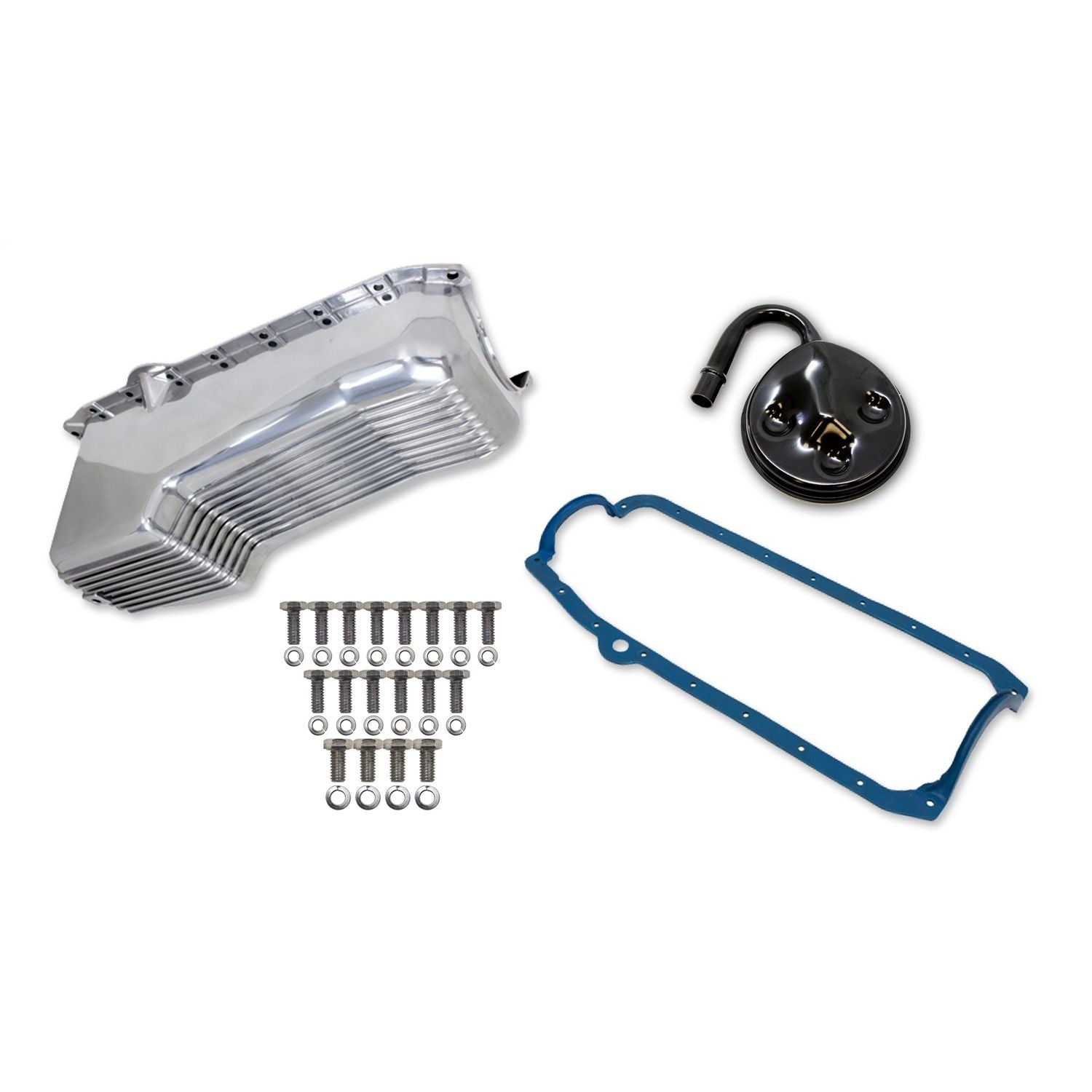 Save time, aggravation and money while also adding great looks to your engine! These kits make an oil pan change simple by having all the necessary components needed for the job. The Finned Cast Aluminum design provides an awesome nostalgic look available Polished or Black powder-coat to compliment the rest of your engine's accessories.