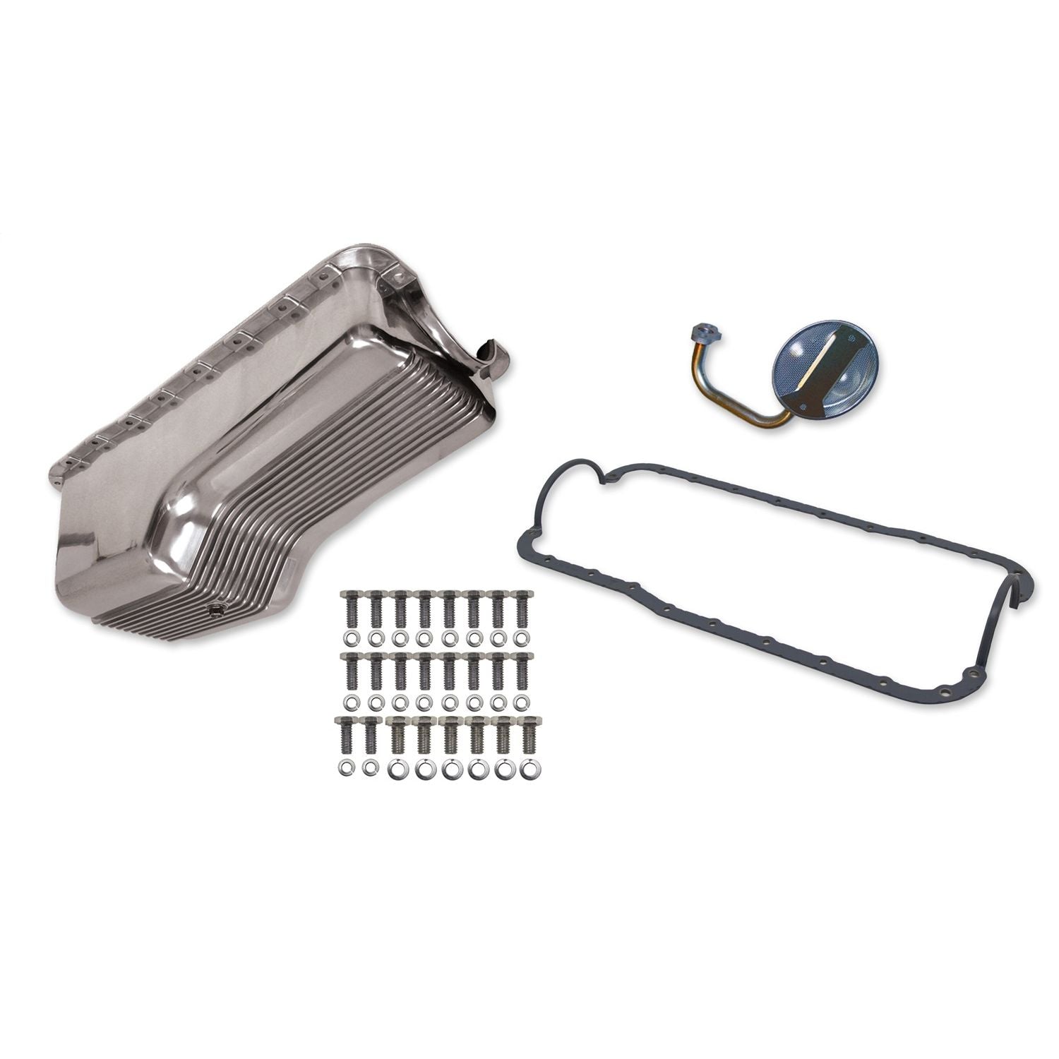 Save time, aggravation and money while also adding great looks to your engine! These kits make an oil pan change simple by having all the necessary components needed for the job. The Finned Cast Aluminum design provides an awesome nostalgic look available Polished or Black powder-coat to compliment the rest of your engine's accessories.