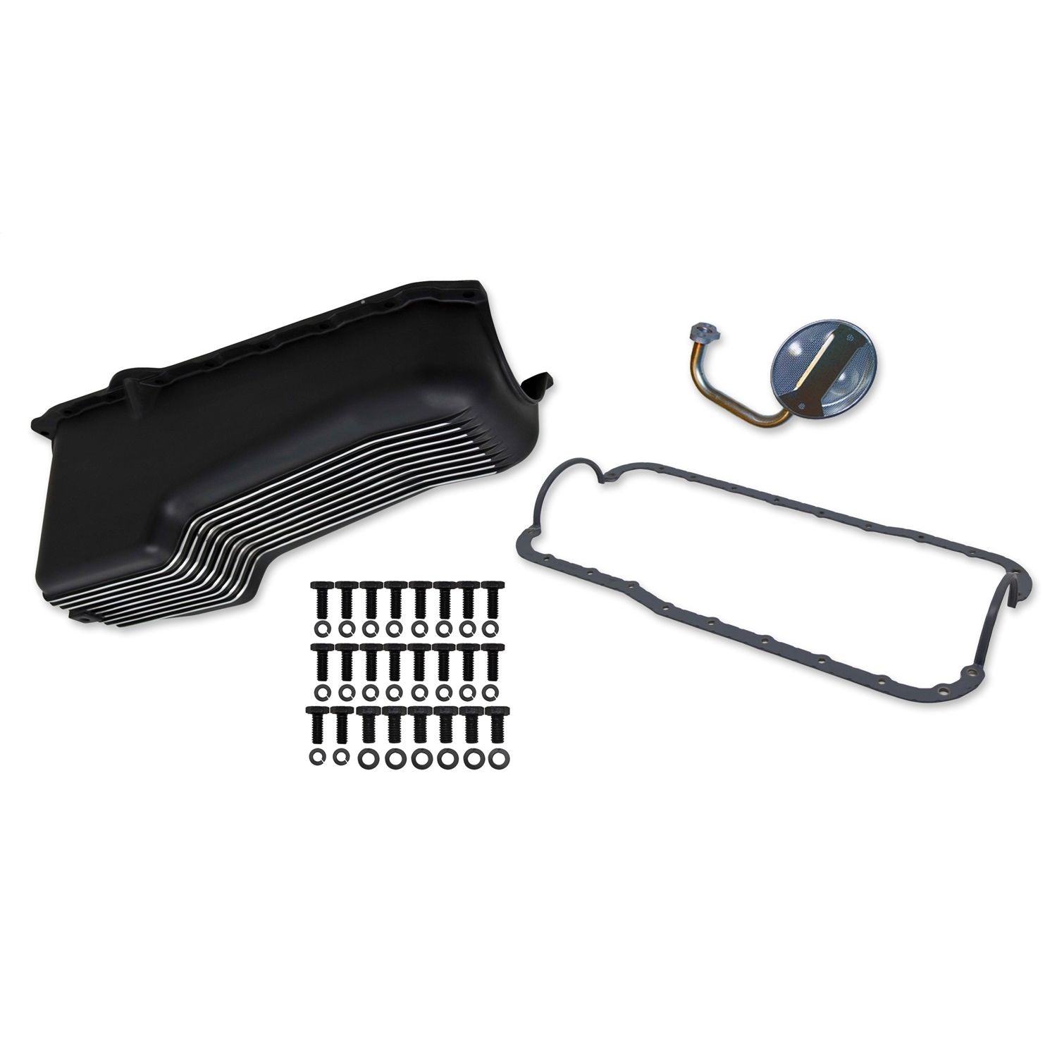 Save time, aggravation and money while also adding great looks to your engine! These kits make an oil pan change simple by having all the necessary components needed for the job. The Finned Cast Aluminum design provides an awesome nostalgic look available Polished or Black powder-coat to compliment the rest of your engine's accessories.