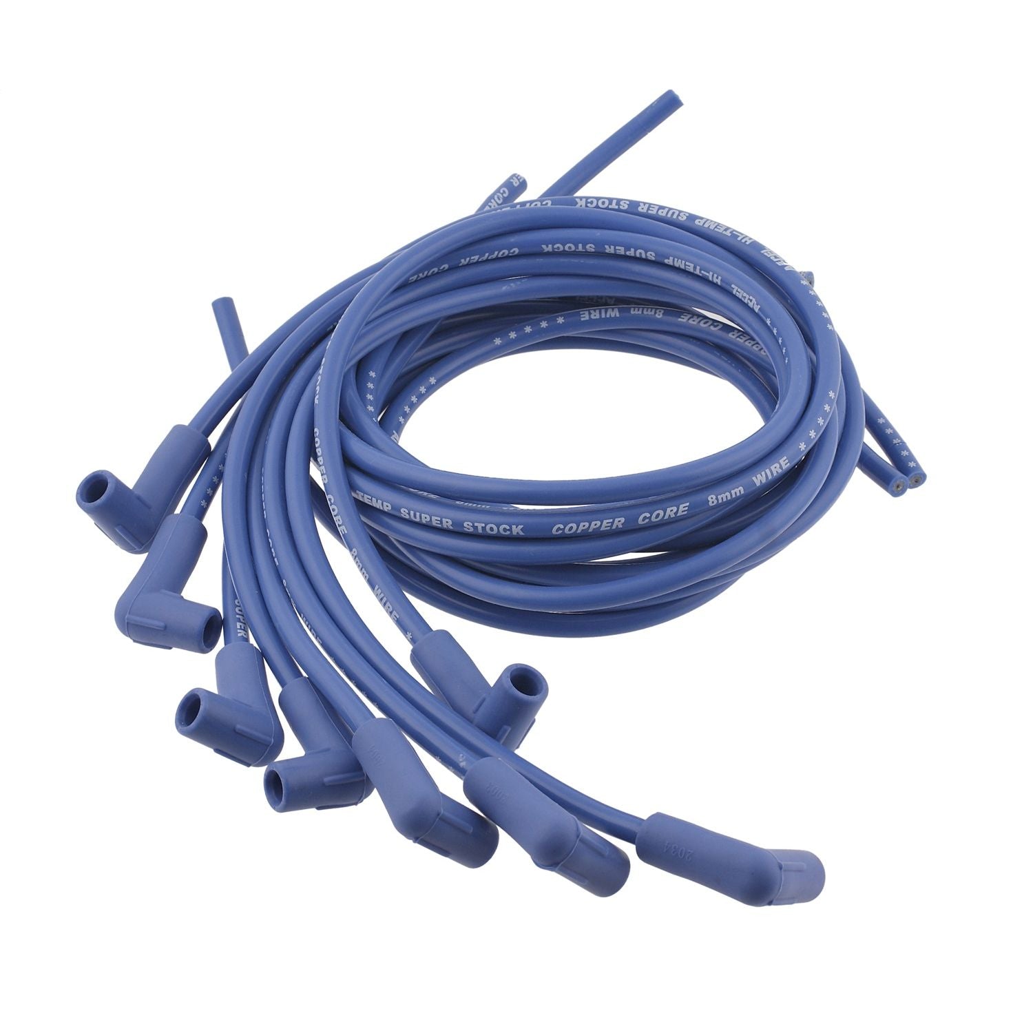 Performance upgrade for 7mm OE applications, silicone jacket with fiberglass braid EPDM insulation, tinned copper core, rated at 450 degrees Fahrenheit. Includes 8 blue extra-long wires, coil lead, silicone boots, zinc-plated steel terminals. Requires terminal and boot installation on distributor end.