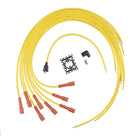 Upgrade for pre-HEI street applications, silicone jacket with fiberglass braid is rated at 450 degrees Fahrenheit, tinned copper core. Includes 8 blue extra-long wires, coil lead, silicone boots, zinc-plated steel terminals. Requires terminal and boot installation on distributor end of wires.