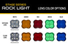 FeaturesReplacement lens for Stage Series Rock LightThick automotive-grade polycarbonateOptical features engineered to spread lightAllows for quick color swapAvailable in Clear Red Amber Blue and GreenOverview. This lens is a direct replacement for the original main lens in your Stage Series LED Rock Lights. It can be used to change both the color and output pattern with a quick swap! Each lens is made of a thick automotive-grade polycarbonate designed to take a beating on the trail.Optically Engineered. Most rock lights are built without optics in mind. They use a simple clear cover to protect from the elements. In true Diode Dynamics style we(TM) ve incorporated optical features to get the best performance possible. Four individual optics are molded into the outer lens which provides excellent spread and even consistent coverage from each light.Colors. Stage Series LED Rock Light lenses are available in clear and diffused options producing a white amber red green or blue color. You can change the color of your single-color rock lights by swapping out the lens.Easy Swap. Changing the outer lens on your Stage Series LED Rock Light takes just a few seconds! Simply snap it off using a small screwdriver and snap your new lens in its place. Take care not to touch the inner optical surface of your new lens during the swap or wear a pair of gloves to keep things clean and you are ready to shine in your new color!