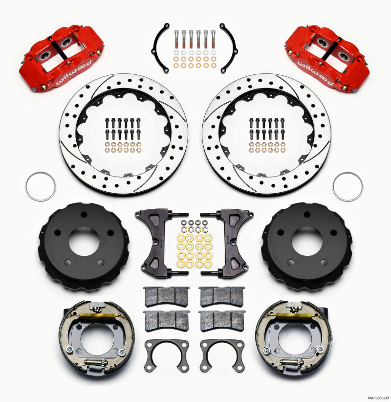 Wilwood Narrow Superlite 4R Rear P-Brk Kit 12.88in Drilled Red Chevy 12 Bolt-Spec 3.15in Brng Front
