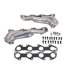 These BBK Performance shorty tuned Length exhaust Headers are designed and constructed as direct fit replacements for all 05-08 5.7L Hemi applications. Each header is manufactured with 1-3/4 in. CNC mandrel bent tubing that offers unrestricted exhaust flow for increased horsepower and torque over factory OEM manifolds. BBK tuned Length headers offer improved scavenging waves for better combustion, which leads to improved performance and fuel economy over stock or equal Length headers. As with all BBK Performance exhaust headers they feature a 3/8 in. laser cut flange for additional strength and a guaranteed leak free fit. All headers are robotically and precision hand welded and then pressure tested to ensure years of reliability and performance in the real world. All BBK exhaust headers are available in titanium ceramic or polished silver ceramic coated finish and include new exhaust header gaskets, header bolts and hardware to complete the installation.